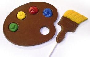 , Colorful and Bright this Artist pallet and brush comes together. Rich Belgian chocolate make up every part of this kit. One pallet with four vibrent colors and brush lolly pop with vibrent chocolate paint on the end! Great for any Art lover in your life at any age from a Art teacher to your Picasso coming home from Pre-School!