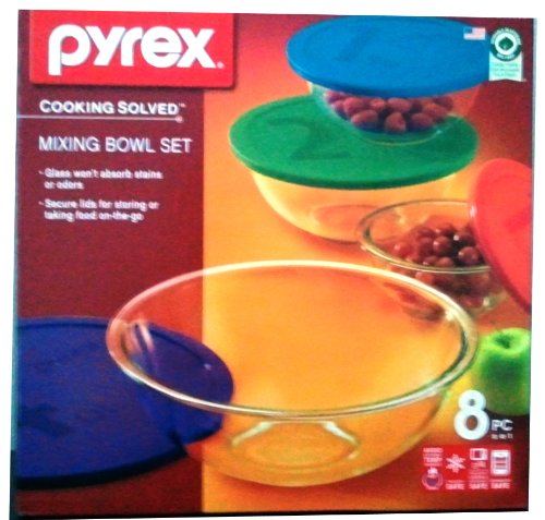 Pyrex Mixing Bowl 8 Piece Set - Glass Bowls That Won't Absorb Stains or Odors, Secure Lids For Storing or Taking Food On The Go! Includes: 1qt/5.8" x 2.7" - bowl with lid. 1.5qt/7.3" x 3.2" - bowl with lid. 2.5qt/8.6" x 3.6" - bowl with lid. 4qt/10.6" x 4" - bowl with lid. Read more customer reviews ...
